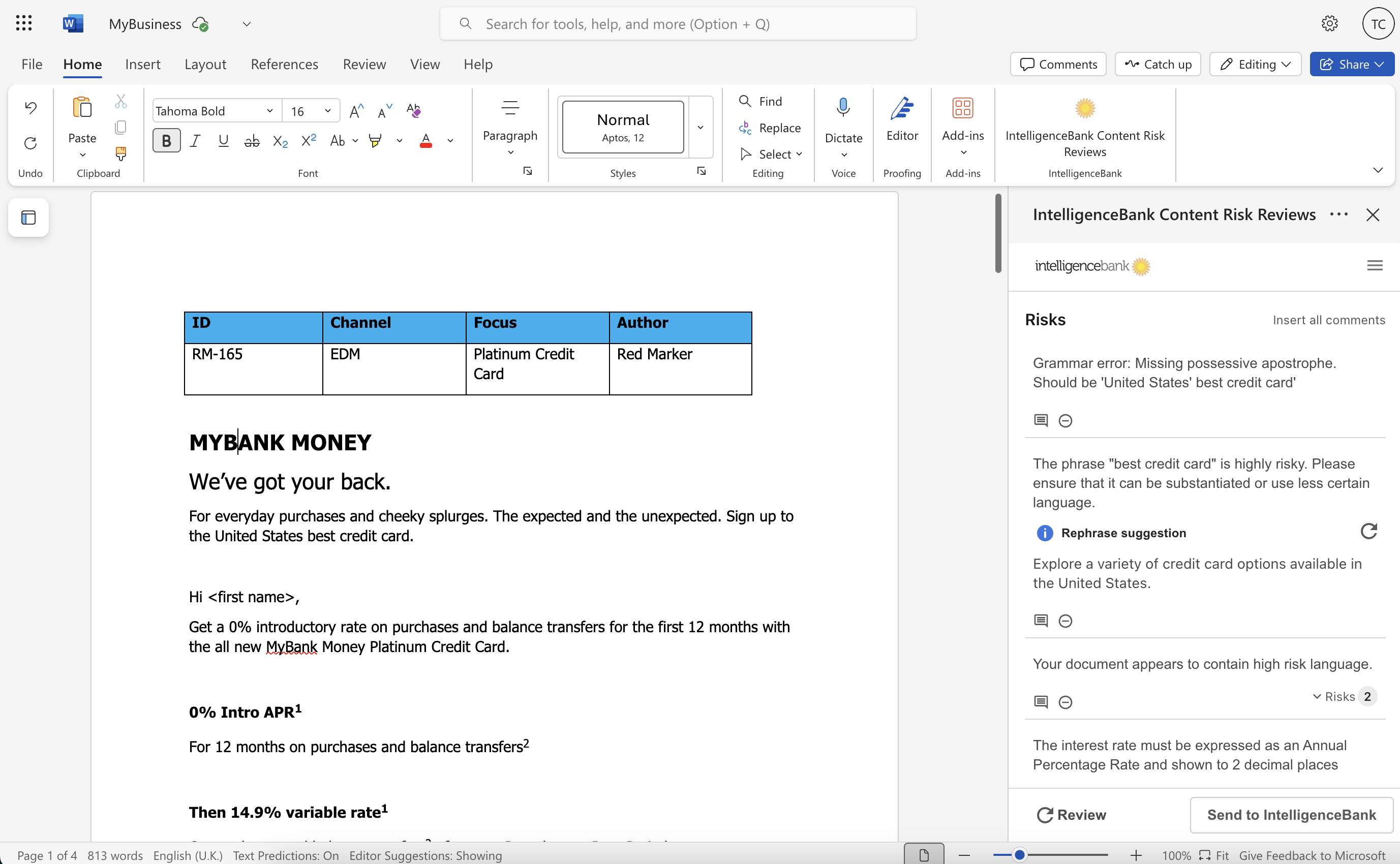 The Content Risk Reviews Add-in for Microsoft Word enables you to apply your custom risk detection rules in real time as you work on your marketing documents. This powerful integration brings compliance checking directly into your Word environment, helping you identify potential legal, compliance, and brand risks while you create and edit content.